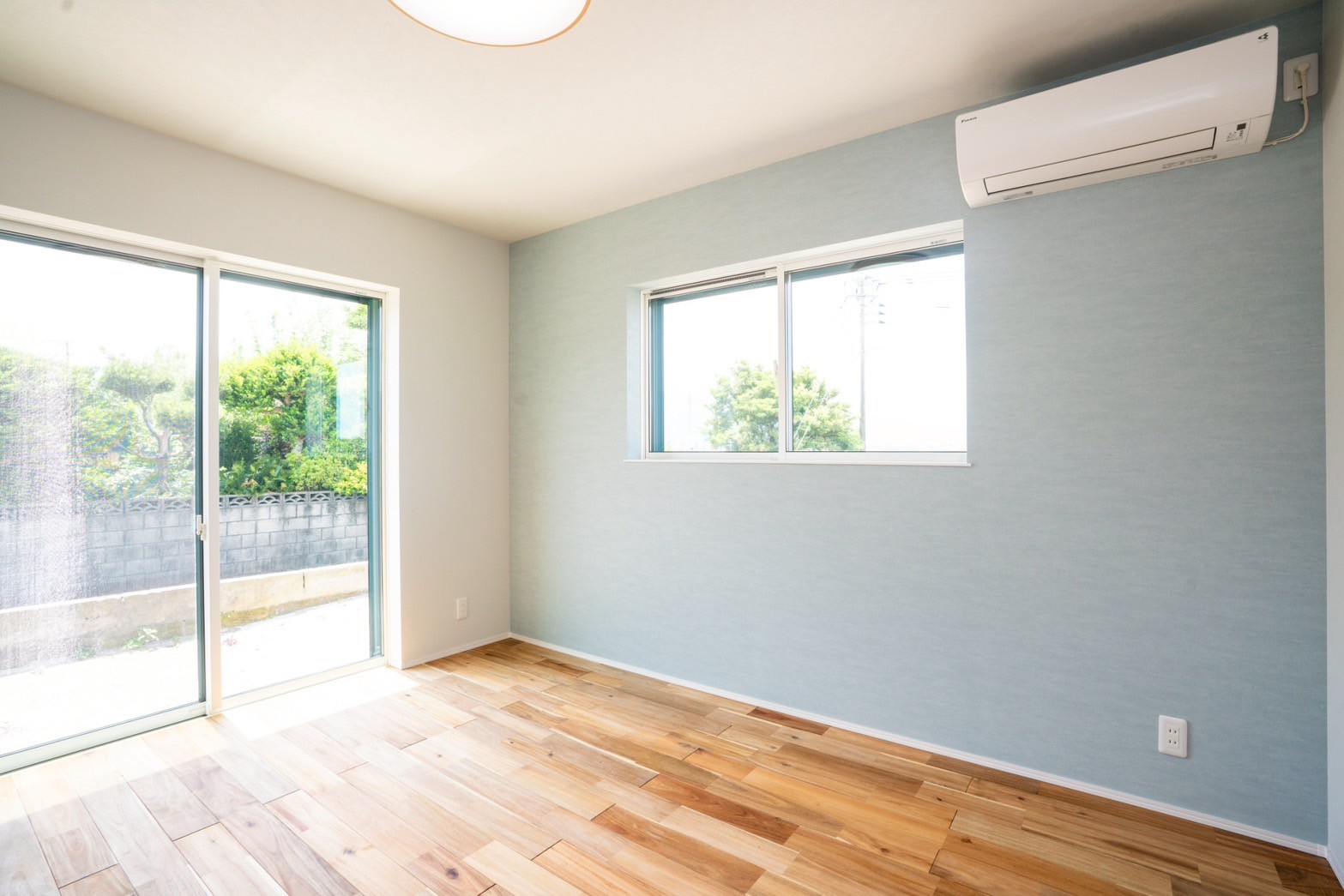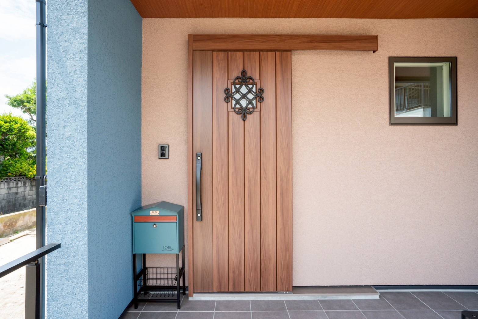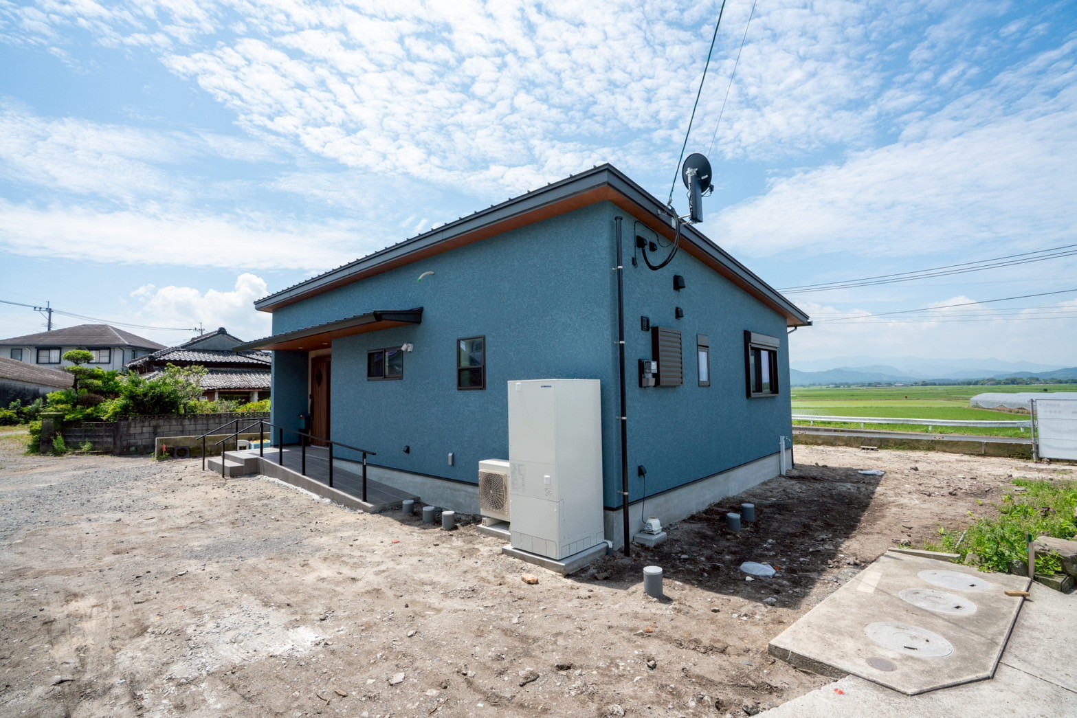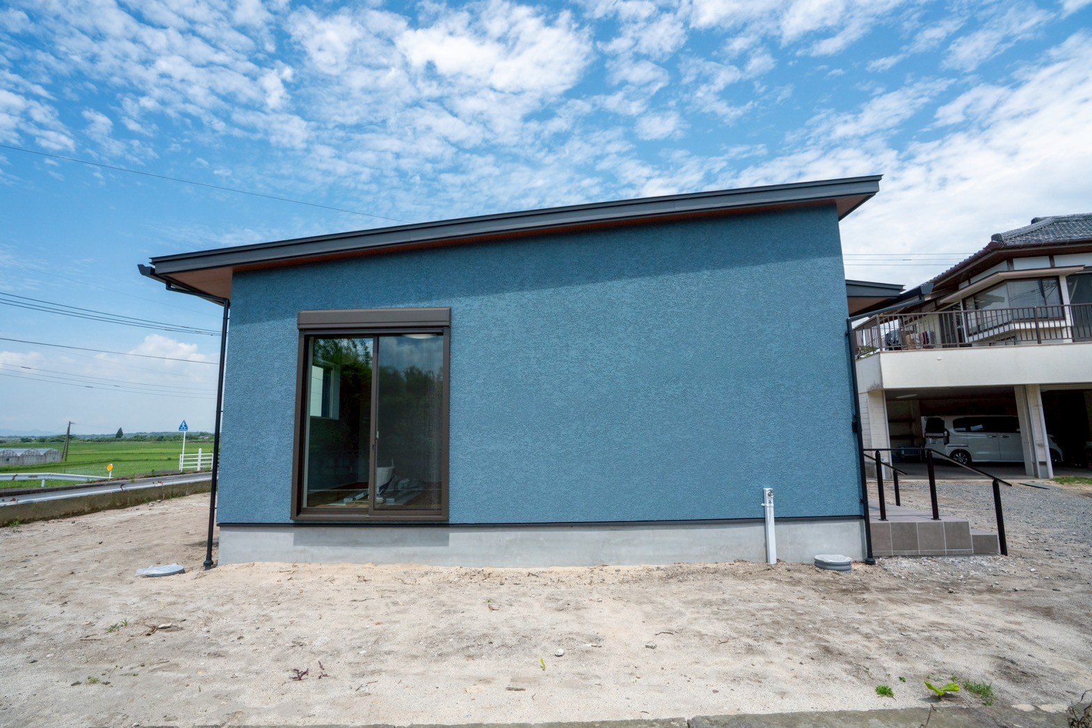 外壁はお施主様が選ばれた、水色×ベージュのやさしい塗り壁。
