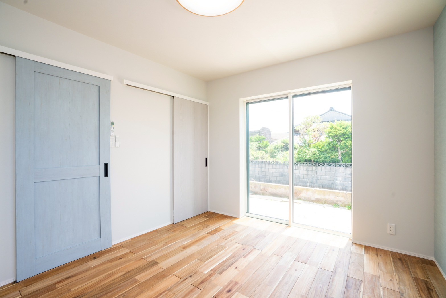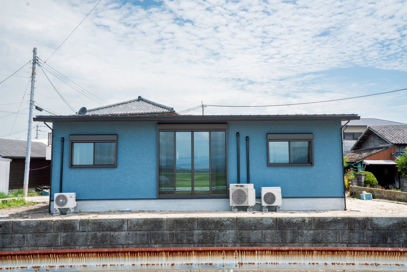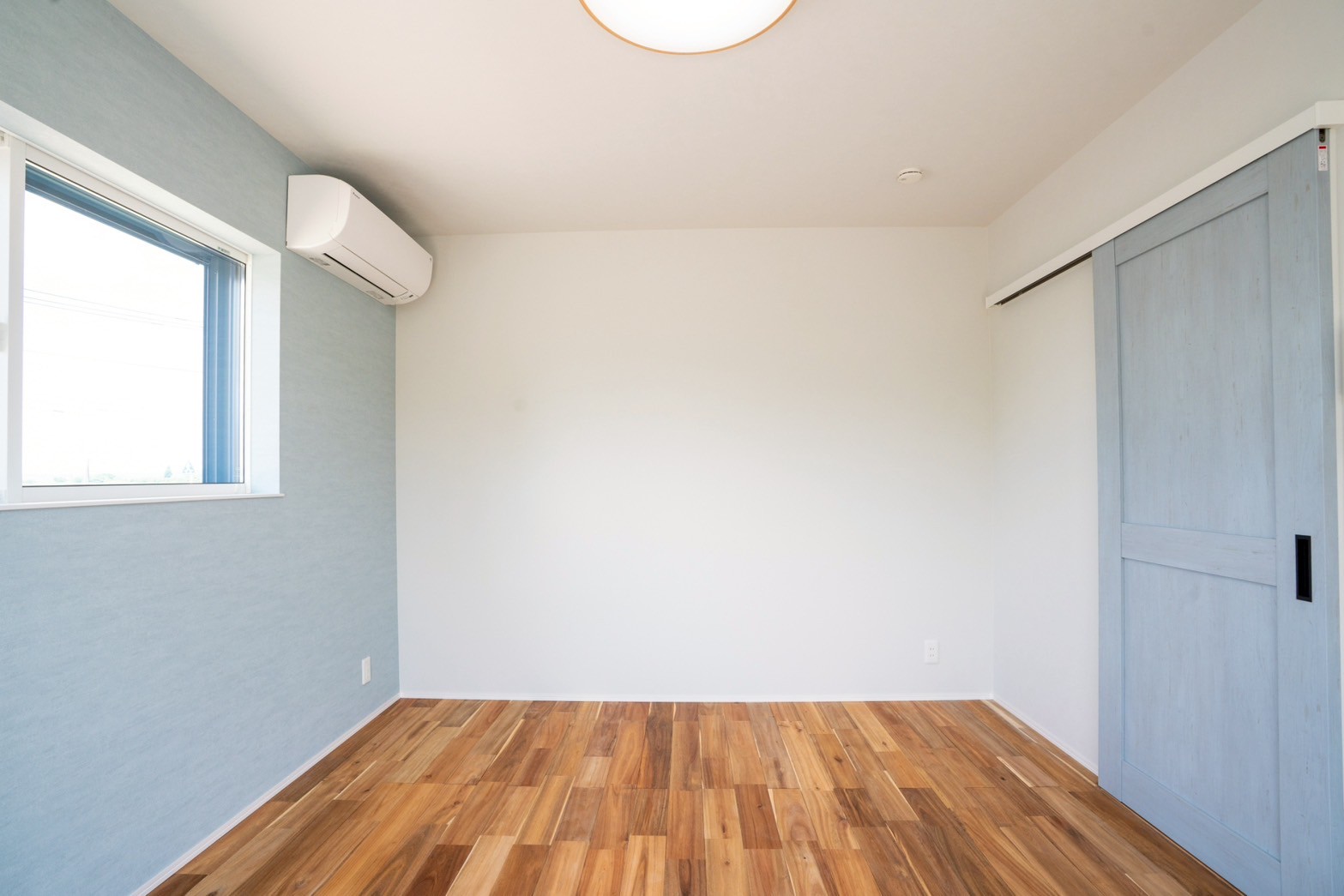 外壁はお施主様が選ばれた、水色×ベージュのやさしい塗り壁。