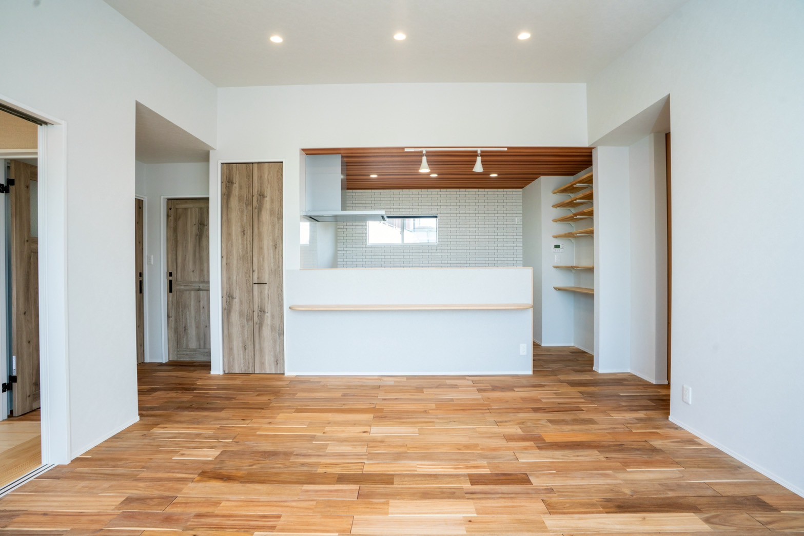 室内には造作棚や造作テーブルを設け、
