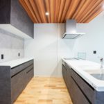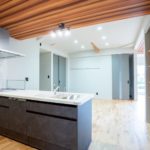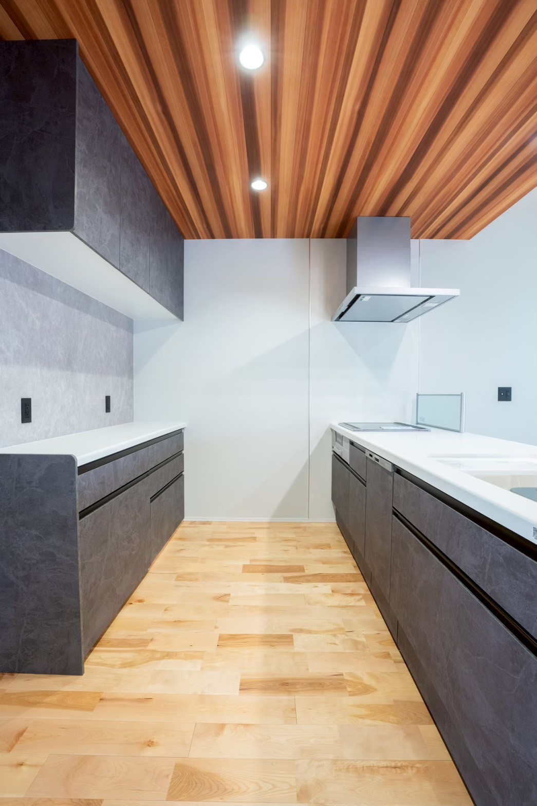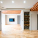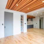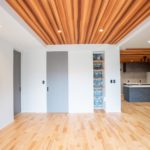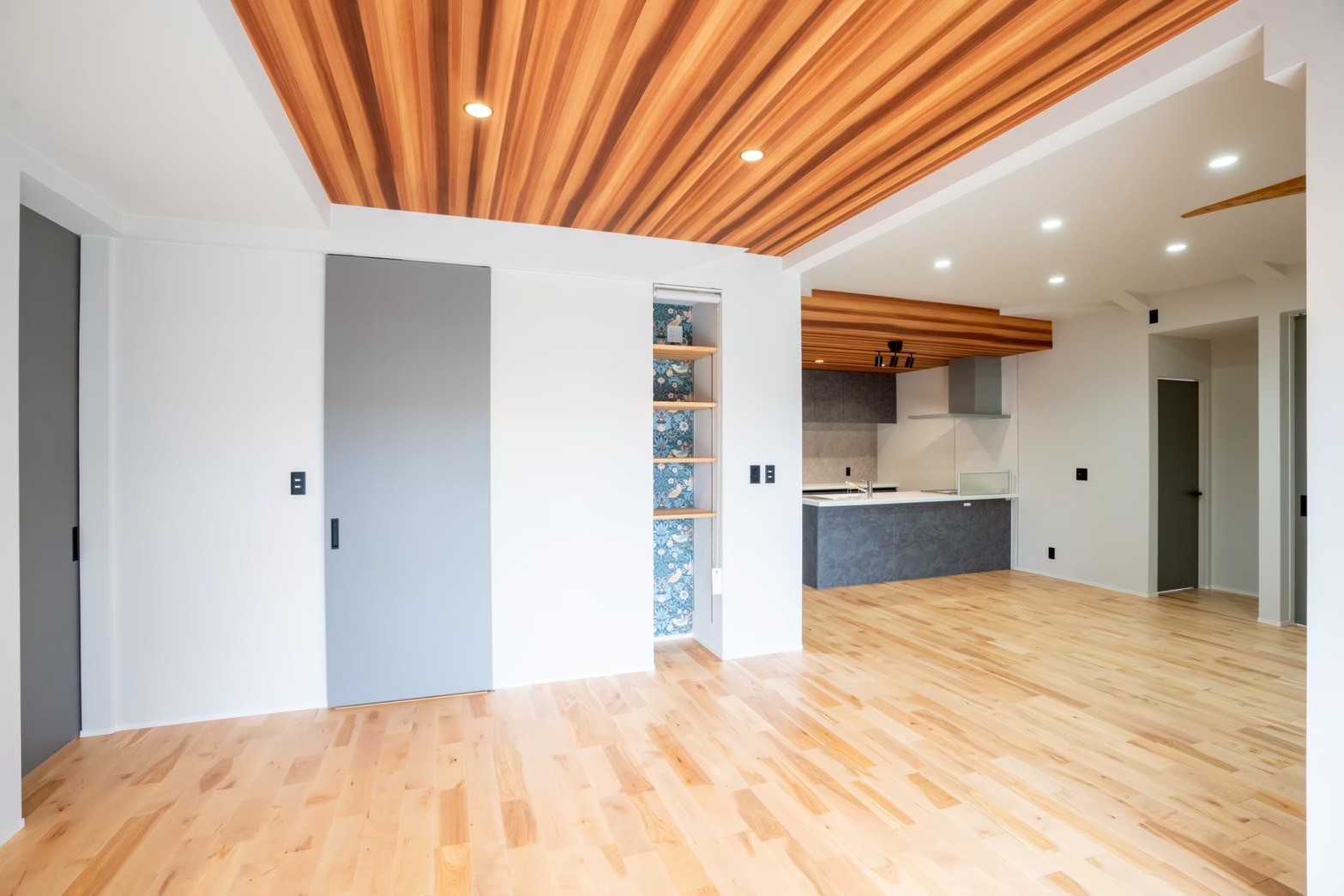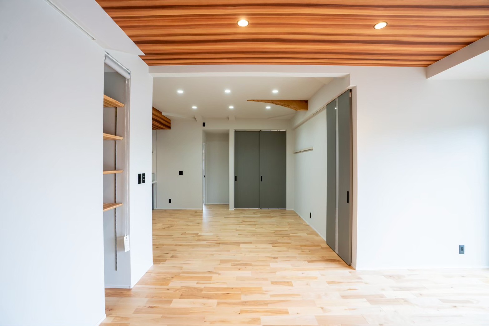 LDKは天井高を2750mm → 2650mm → 2560mm と段階的に変えることで、空間にリズムと奥行きをつくりました。