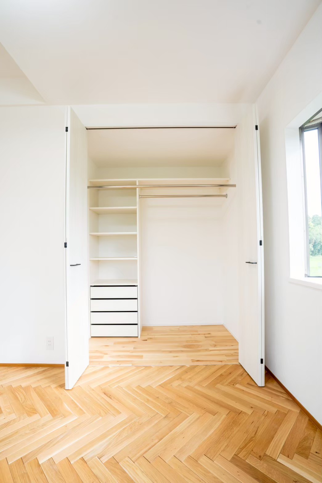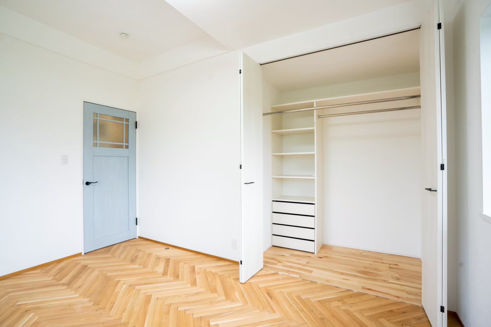 施主様お気に入りのヘリンボーンの床を寝室に採用しました。