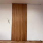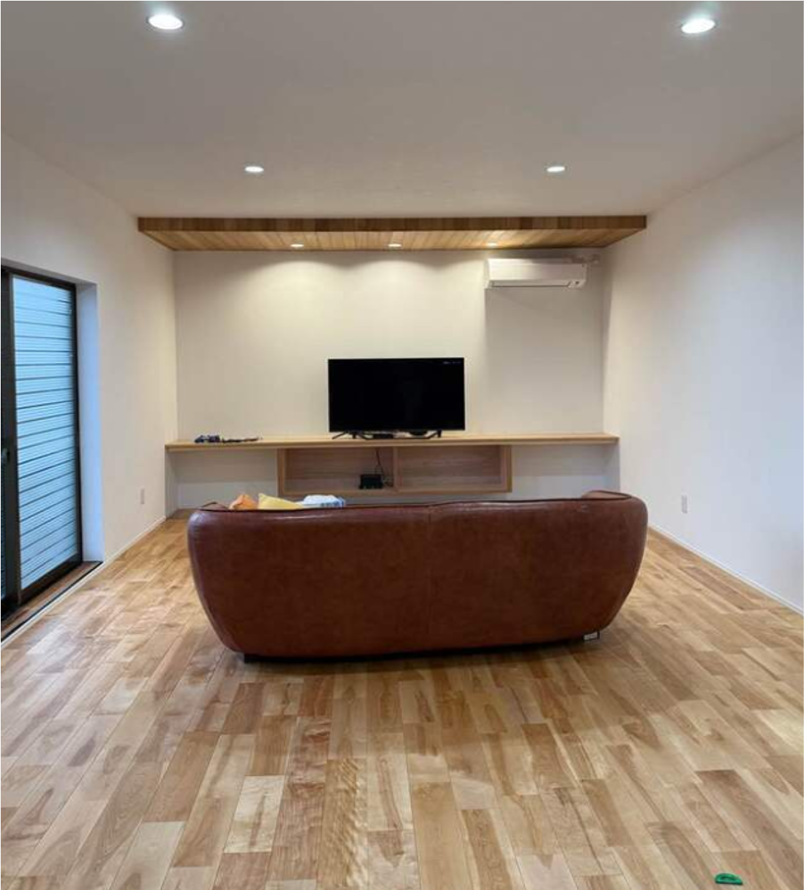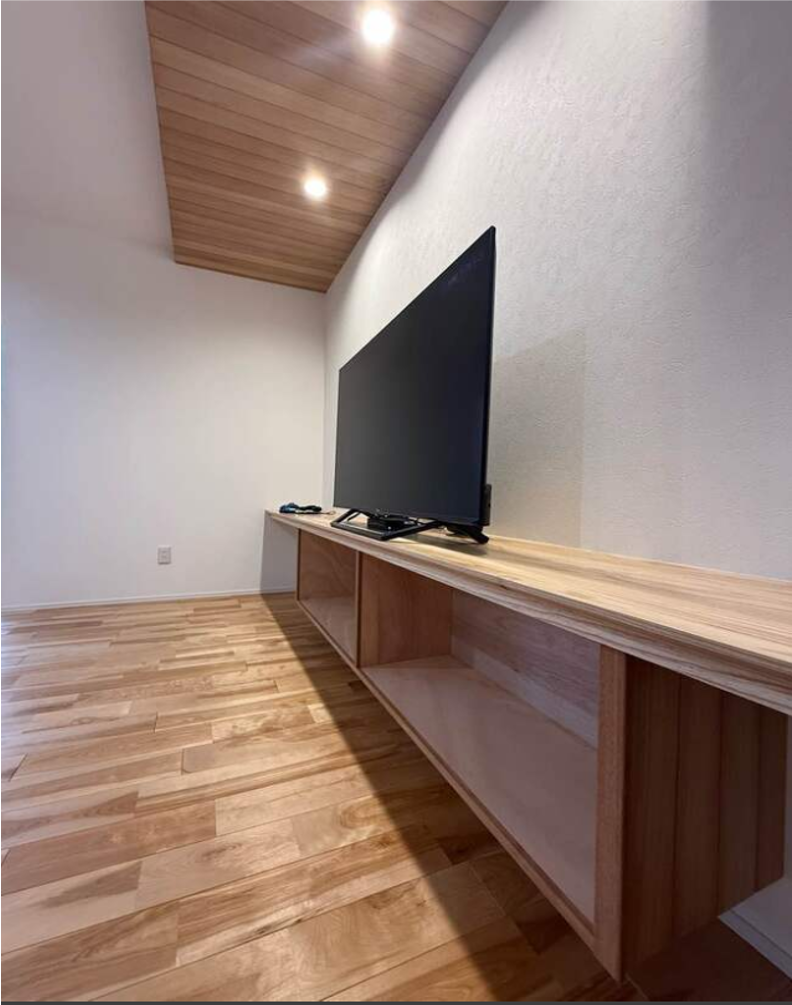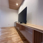 建具を造作にし、ドア・テレビ上のアクセント天井・玄関天井・テレビ裏の木材を同じ素材で統一。
