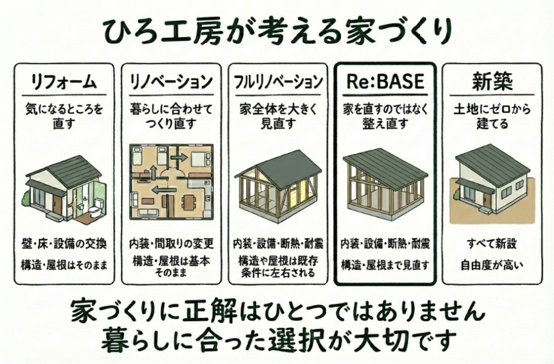Re:BASEは、一般的なフルリノベーションとは違い、屋根や構造まで見直し、暮らしの制限そのものを取り除く家再生リノベーションです。